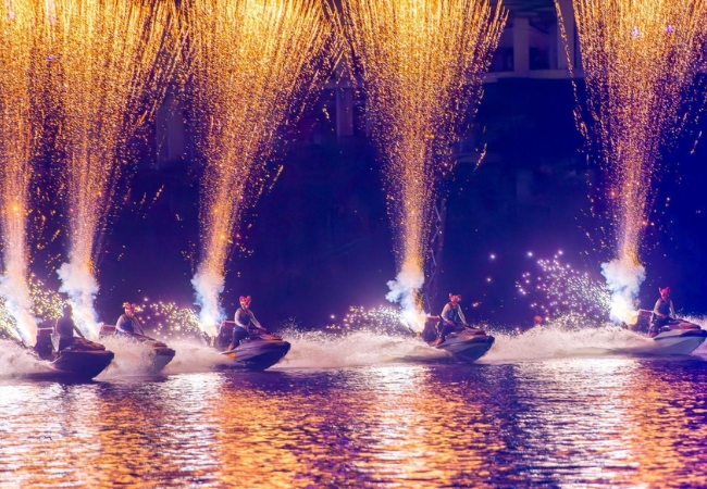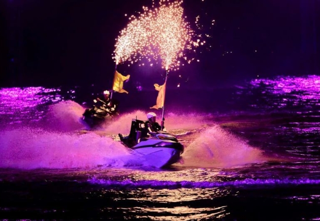 Đội hình 36 chiếc jetski di chuyển đồng loạt trên mặt biển tạo nên những đội hình phức tạp với độ chính xác đến từng giây. Mỗi phương tiện đều được trang bị bộ điều khiển riêng, nhận tín hiệu thời gian để kích hoạt pháo hoa chính xác tuyệt đối.
